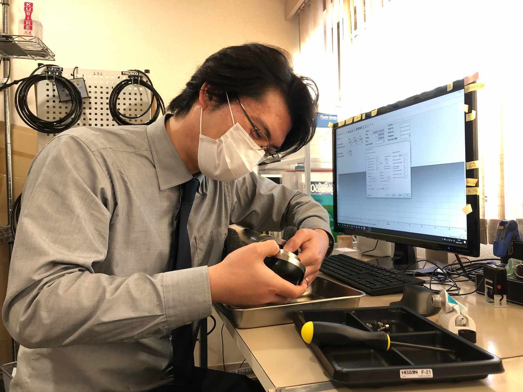 Dr Tanaka working on a Nortek Aquadopp 6000 m during his on-the-job training.