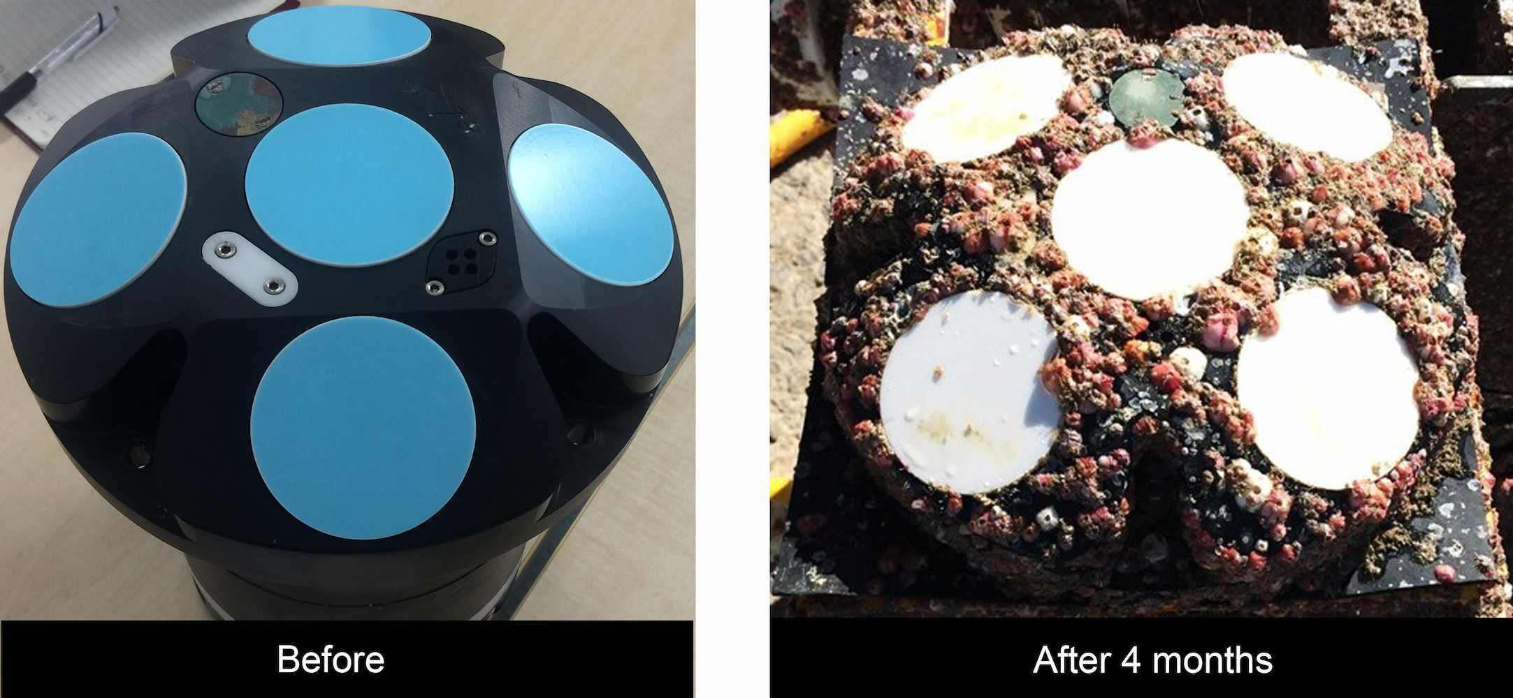 ・After six months of underwater deployment, some biofouling may start to attach to the surface of the stickers. Although the stickers can be cleaned by wiping gently, the antifouling effect may have been somewhat reduced, so we strongly recommend replacing them with a new set.